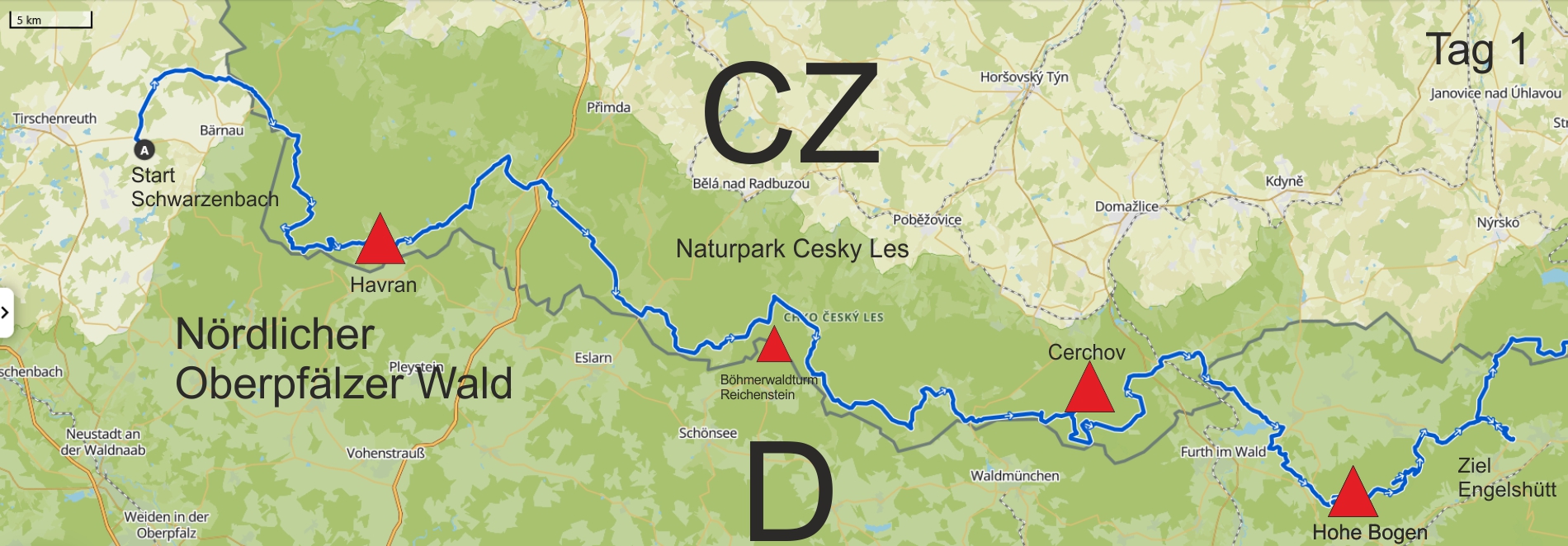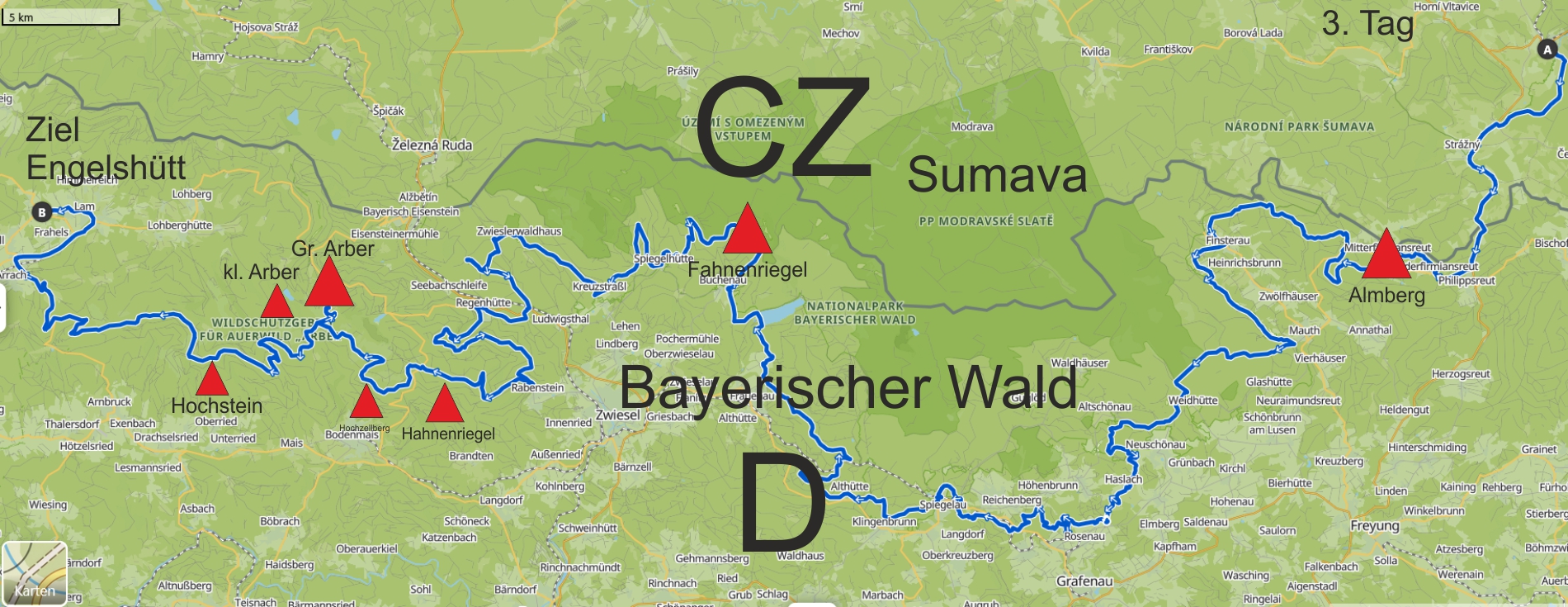 Ein echtes Highlight des Tages war der Anstieg zum Čerchov (1042 m), von dessen Turm sich ein weiter Rundumblick über den Böhmerwald und die Bayerwald-Gipfel bot. Nach dem Grenzübertritt bei Eschlkam war ursprünglich noch ein Abstecher zum Hohen Bogen geplant – aus Zeitgründen musste dieser jedoch gestrichen werden.