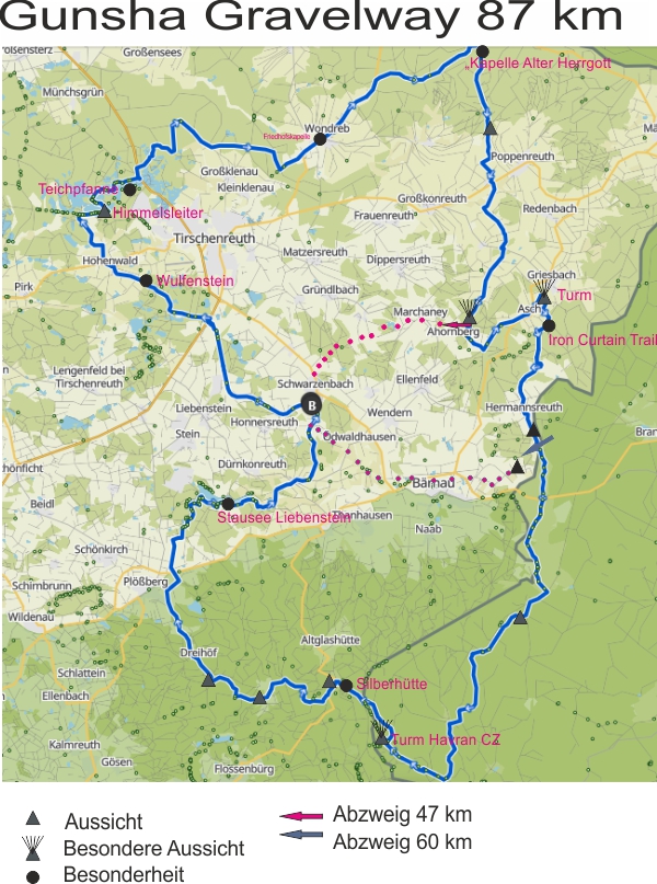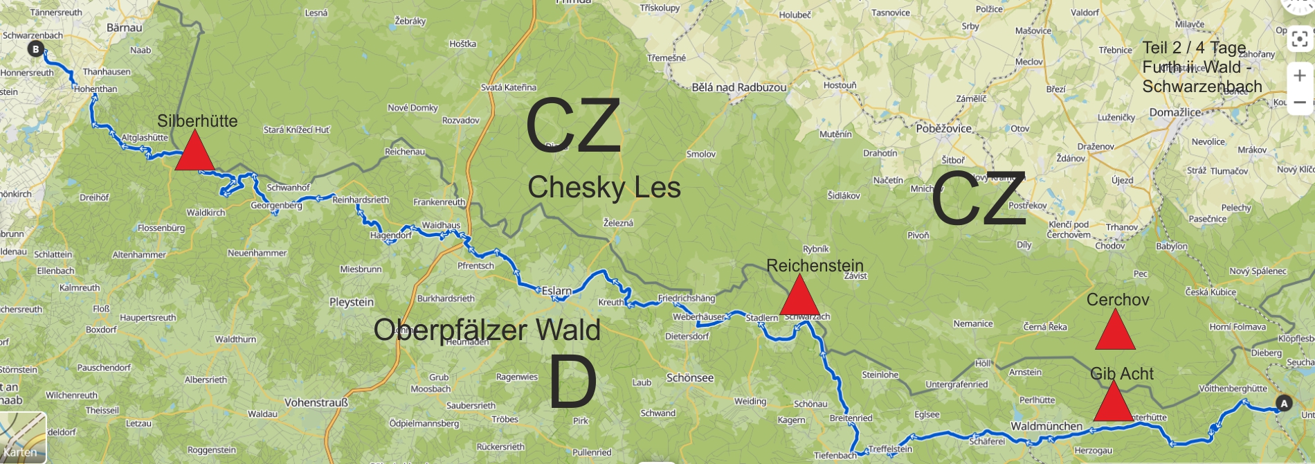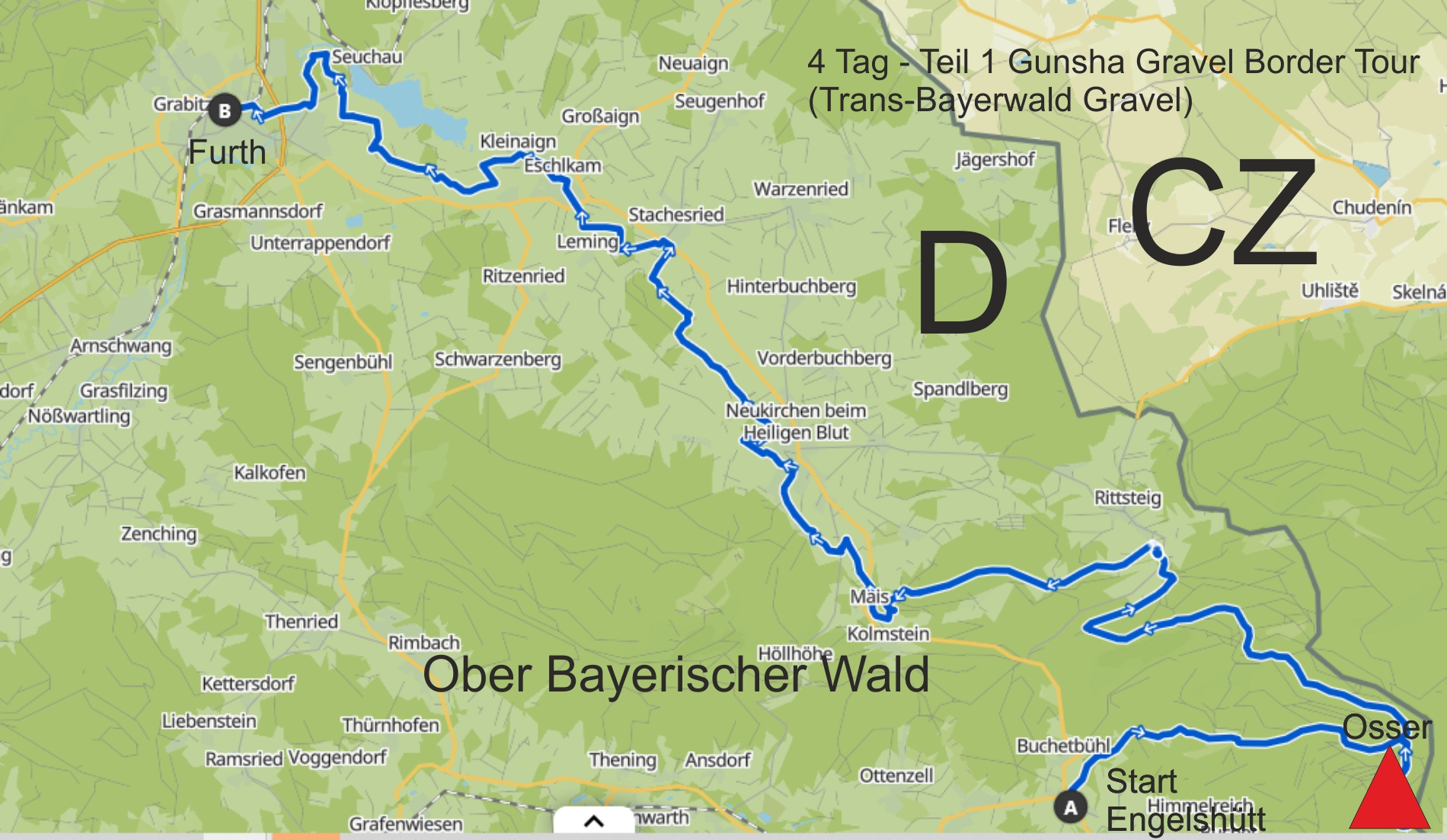 Nach der Abfahrt ging es hinunter nach Furth im Wald, dem offiziellen Ende der Trans Bayerwald Gravel Nordroute. Ab hier verließen sie die markierte Strecke und folgten nun ihrer eigenen Route – teils auf dem Grünen Dach Radweg, überwiegend aber auf selbstgeplanter Strecke durch den Oberpfälzer Wald.