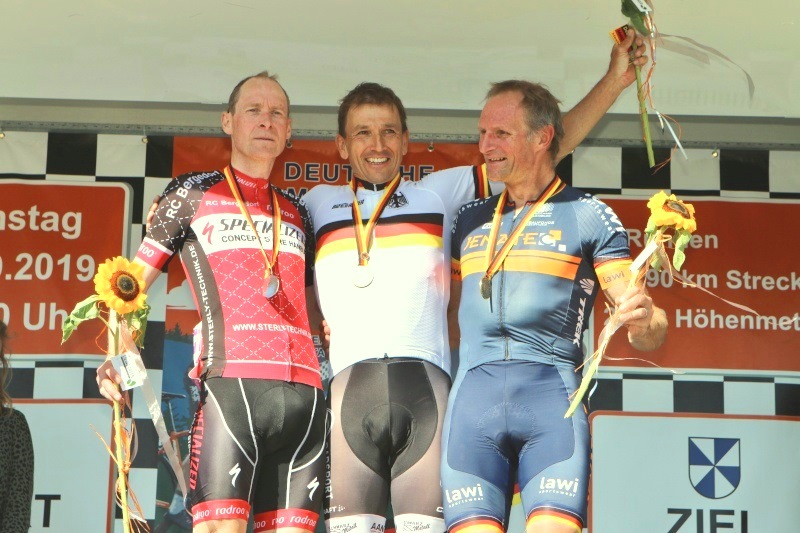 Nach 3 der 7 Runden schien eine Vorentscheidung gefallen,  denn Lastowsky konnte sich als einziger Ü50 Fahrer, im schweren, etwa 2 km langen Hauptanstieg in der 2´ten Verfolgergruppe halten. Die ärgsten Widersacher Matthias Sterly aus Hamburg und Michi Schaefer aus Leipzig vielen hier zurück. Doch Sterly kam zum Ende der dritten Runde nochmal zur Gruppe zurück. Somit war Lastowsky zum Handeln gezwungen, da die Gruppe nun nicht mehr lief und weitere Fahrer aufschließen konnten. Also setzte der Oldie des RC Wendelstein eine Attacke am Anstieg zur vierten Runde, und nun war Sterly geschlagen. Durch die Selektion bildete sich eine acht Fahrer umfassende Gruppe die bis zum Finale sauber zusammen arbeitete, was “Maddes“ seinen nun insgesamt  fünften Deutschen Meistertitel bescherte. Sterly und Schaefer  kamen mit ungefähr 4 bzw. 6 Minuten Rückstand auf den glücklichen Seriensieger  ins Ziel, der somit seine letzten Rennkilometer im schönen Sauerland richtig genießen konnte. In der Gesamtwertung belegte der 55 Jährige mit etwa 9 Minuten Rückstand auf Nationalfahrer Hannes Wilksch vom LV Brandenburg den 30. Gesamtrang. Ein zwar noch achtbares Ergebnis, aber für den nach Dienstjahren noch jungen Nachwuchstrainer des RC Wendelstein auch ein weiterer Hinweis, sich in den nächsten Jahren vorrangig  um den Radsportnachwuchs zu kümmern.